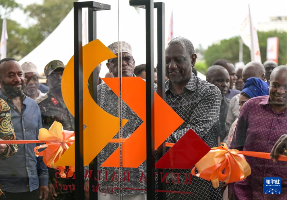 9月17日,在位于肯尼亞蒙巴薩島上的蒙巴薩火車站,肯尼亞總統魯托(前右二)為蒙巴薩通勤米軌新站房剪彩。