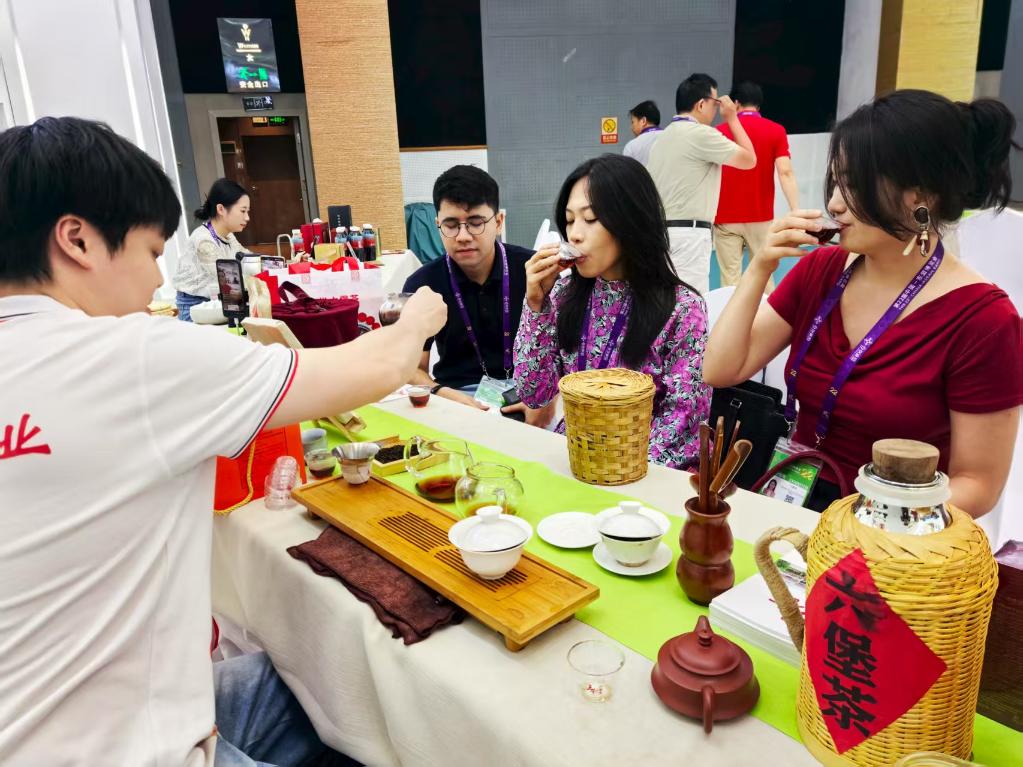 來自菲律賓的大學老師蘭朵拉·瑪甘(右二)第一次品嘗廣西六堡茶。新華社記者王楚然 攝