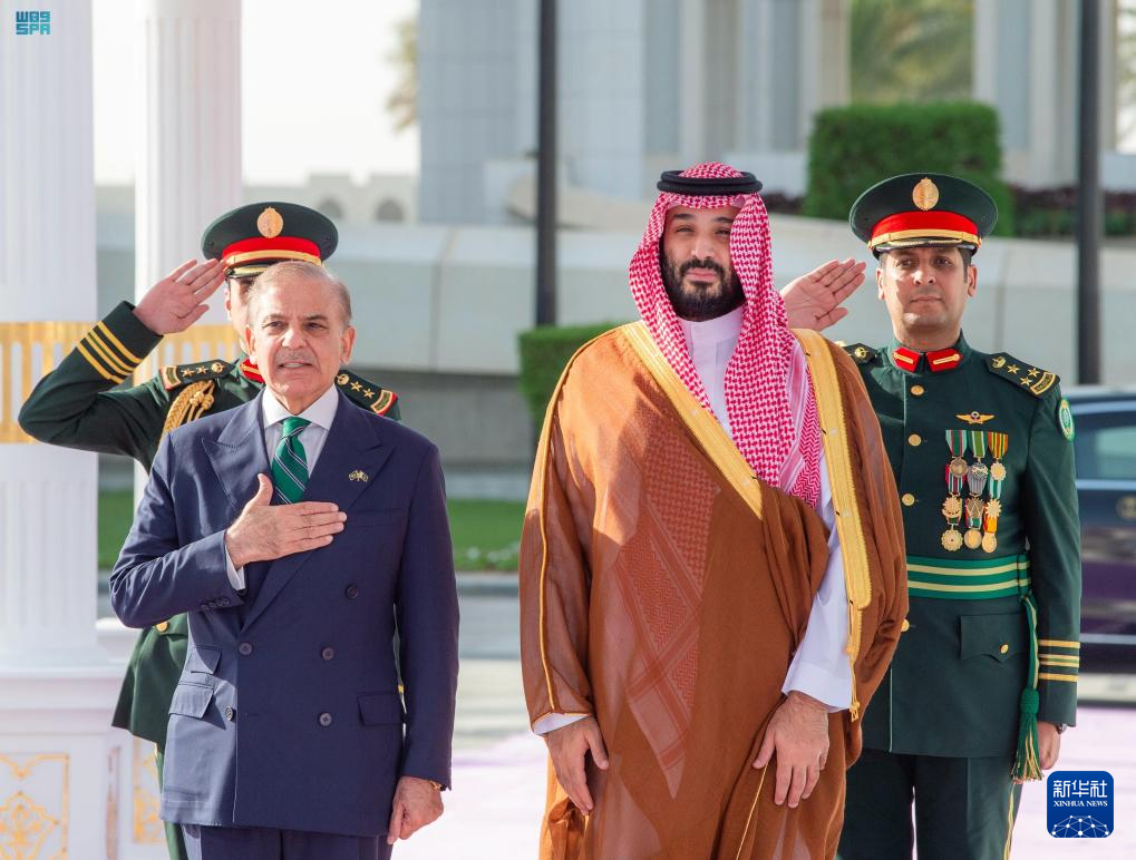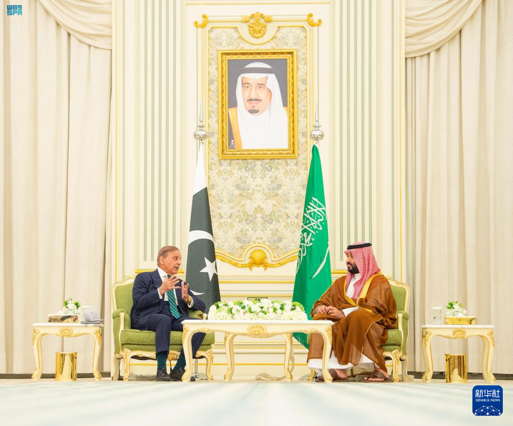 9月17日,沙特阿拉伯王儲兼首相穆罕默德·本·薩勒曼(前右)在首都利雅得與到訪的巴基斯坦總理夏巴茲·謝里夫舉行會談。