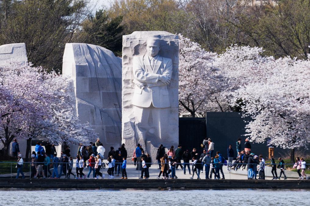 這是2024年3月18日在美國華盛頓的潮汐湖畔拍攝的櫻花和馬丁·路德·金的雕塑。新華社發(亞倫攝)