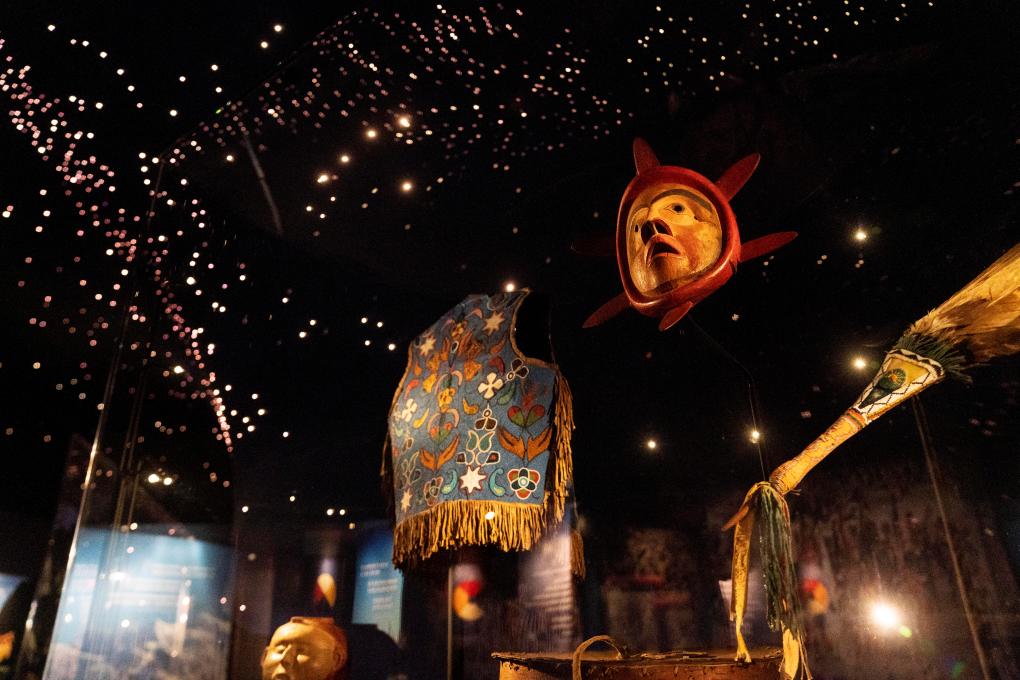 這是2022年5月17日在美國華盛頓拍攝的美洲印第安人國家博物館里的服飾和面具。新華社記者劉杰攝