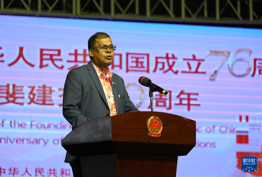 9月27日,斐濟代總理兼財政、戰略規劃、國家發展和統計部長比曼·普拉薩德在蘇瓦舉行的慶祝中華人民共和國成立76周年暨中斐建交50周年活動上致辭。新華社發(高鑫攝)