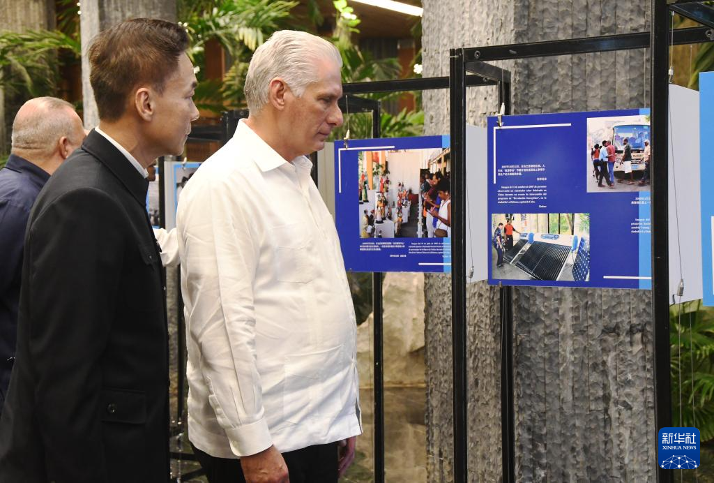 9月29日,在古巴首都哈瓦那革命宮,古巴共產黨中央第一書記、國家主席迪亞斯-卡內爾(右)參觀中古建交65周年圖片展。新華社發(華金·埃爾南德斯攝)