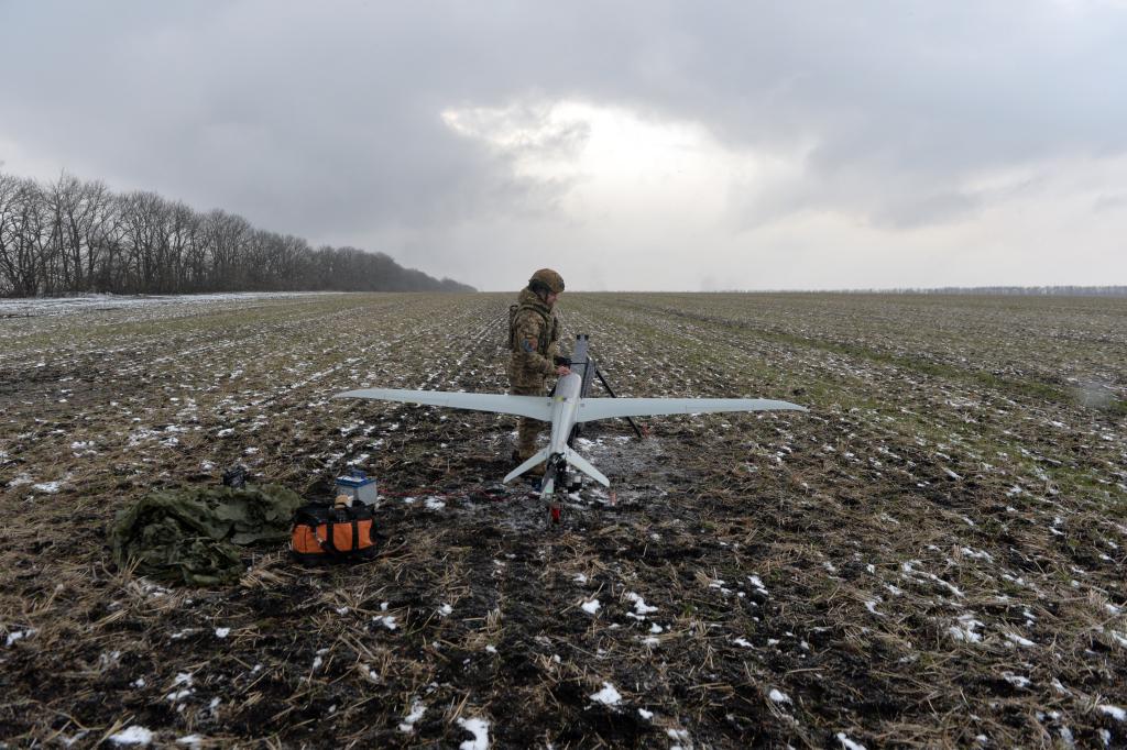 2月5日,在波克羅夫斯克前線作戰的烏克蘭第25獨立空降旅士兵將安裝調試好的無人機搬運到發射裝置上。新華社發(彼得·德魯克攝)
