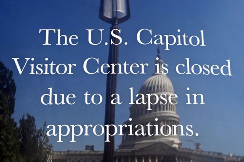 10月1日,在美國華盛頓的美國國會大廈前,公告牌顯示國會大廈游客中心因美國聯邦政府“停擺”而關閉。新華社記者 李睿 攝