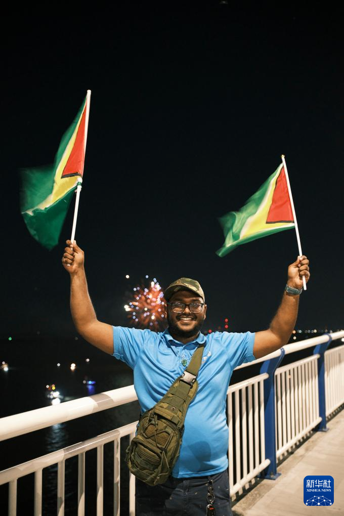10月5日,在圭亞那首都喬治敦,一名男子揮舞圭亞那國旗在巴拉特·賈格迪奧-德梅拉拉河大橋上與身后的煙花合影。新華社記者 許詠政 攝