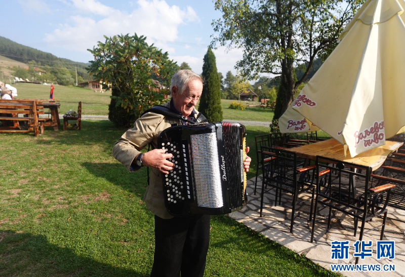 當地時間9月29日,在塞爾維亞西南部馬連山區的“好客民族村”民俗村落,一位當地村民手拉手風琴,演奏傳統民謠,歡迎中國游客到訪。新華網記者陳穎 攝