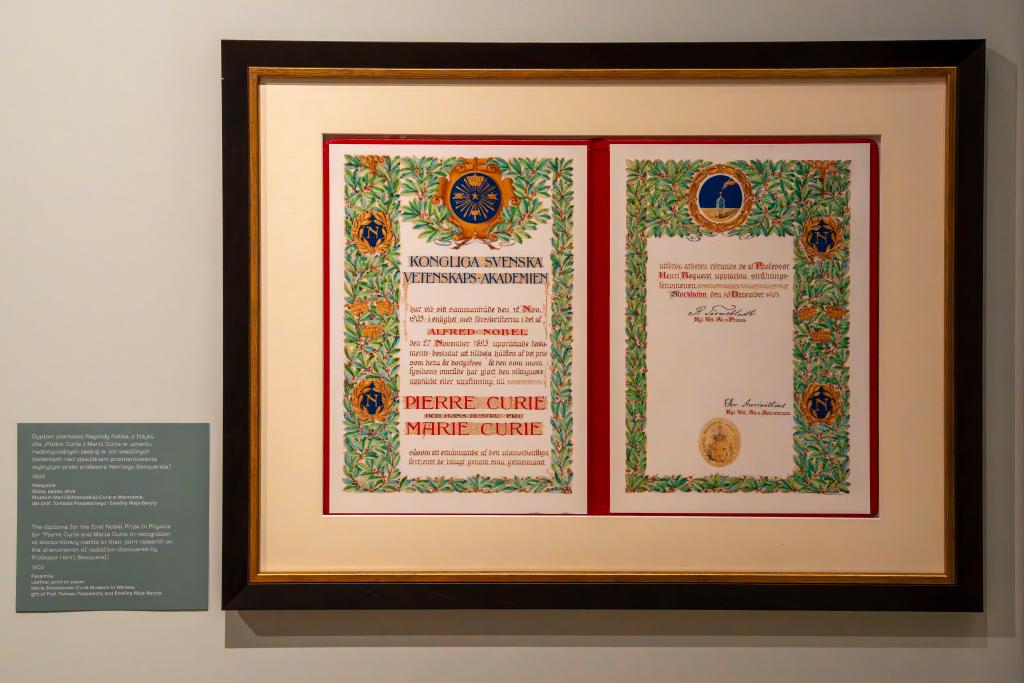 這是10月7日在波蘭華沙的瑪麗·斯克洛多夫斯卡-居里博物館拍攝的居里夫婦1903年獲得諾貝爾物理學獎的證書復制品。新華社記者 夏原一 攝