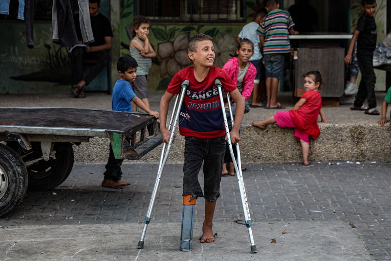 10月5日,年僅10歲的少年拉提卜·阿布·卡里克在加沙地帶中部代爾拜拉赫附近的聯合國臨時安置機構內拄著拐杖行走。在數月前的一次以色列空襲中,拉提卜失去了右腿致殘,他的母親和兄弟也在襲擊中身亡。 新華社發(里澤克·阿卜杜勒賈瓦德攝)