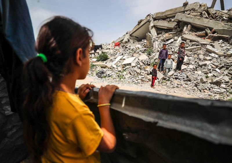 這是2025年4月7日在加沙地帶北部加沙城拍攝的流離失所的兒童。新華社發(馬哈茂德·扎基攝)