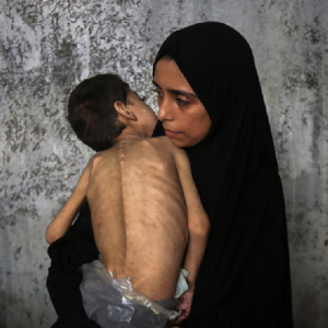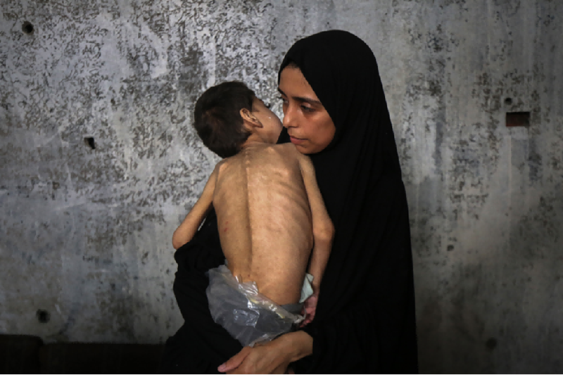 7月25日,在加沙城一處避難所,一名女子懷抱營養不良并患病的兒童。新華社發(里澤克·阿卜杜勒賈瓦德攝)