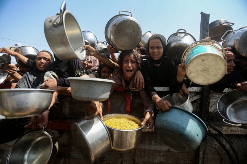 2025年8月10日,民眾在加沙城領取免費食物。新華社發(里澤克·阿卜杜勒賈瓦德攝)