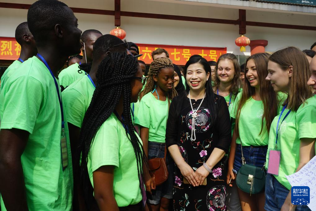 江再紅(中)給外國留學生講解湘繡知識(資料照片)。