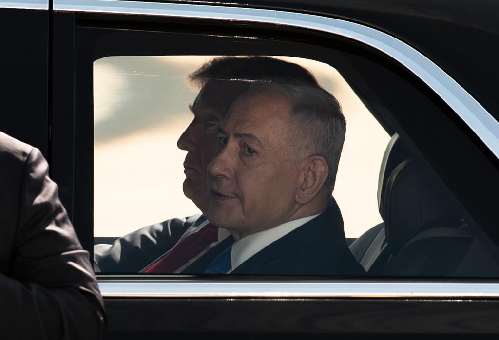 10月13日,在以色列本-古里安機場,以色列總理內塔尼亞胡(前)同到訪的美國總統特朗普同乘一輛車。新華社記者陳君清攝