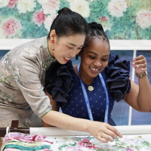 10月14日,來自博茨瓦納的嘉賓在展覽上體驗中國刺繡。
