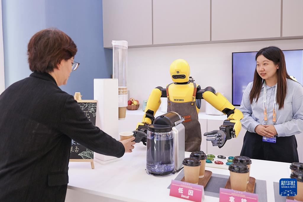 10月14日,參觀者在展覽上體驗機器人制作咖啡。