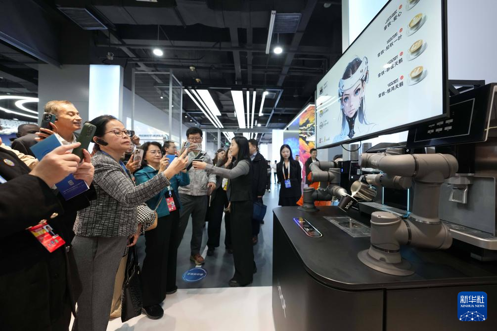 10月14日,嘉賓在北京經開區機器人大世界觀看咖啡機器人演示。