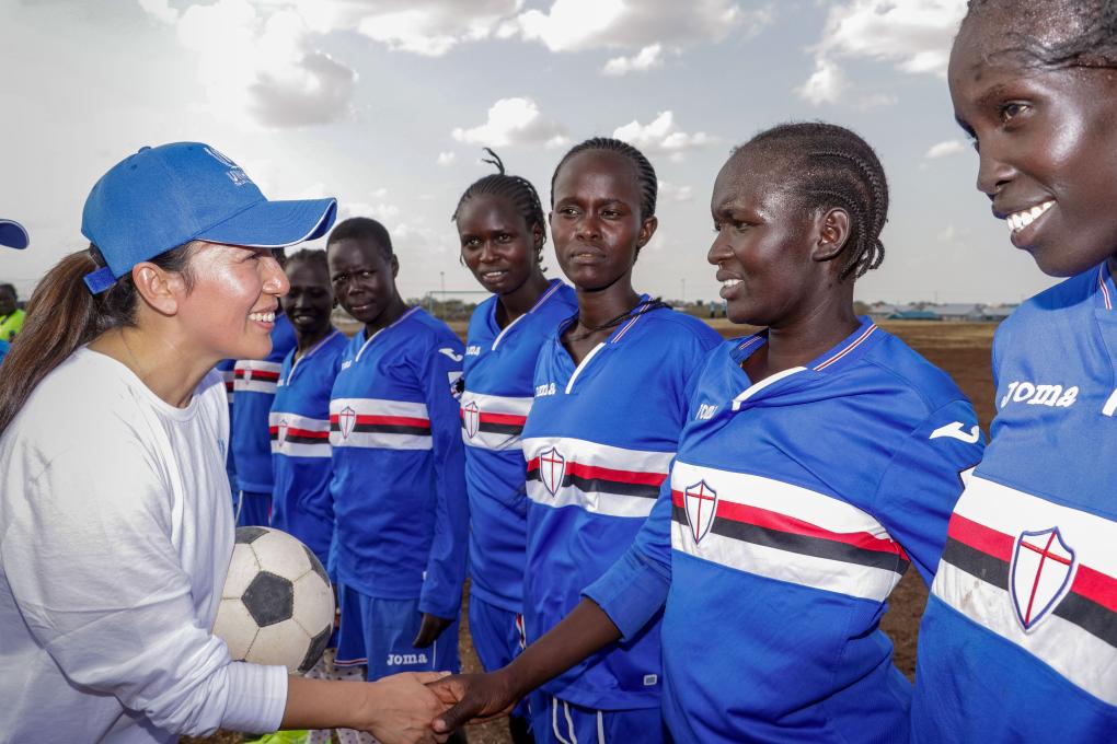 2024年2月21日,聯合國難民署親善大使、奧運冠軍楊揚(左前)與卡庫馬難民營女子足球隊隊員交流。新華社發(聯合國難民署供圖)
