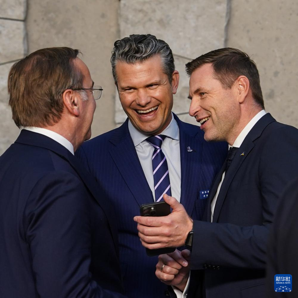 10月15日,在比利時布魯塞爾舉行的北約防長會議結束后,美國國防部長赫格塞思(中)與愛沙尼亞國防部長佩夫庫爾(右)、德國國防部長皮斯托里烏斯交談。新華社記者 彭子洋 攝