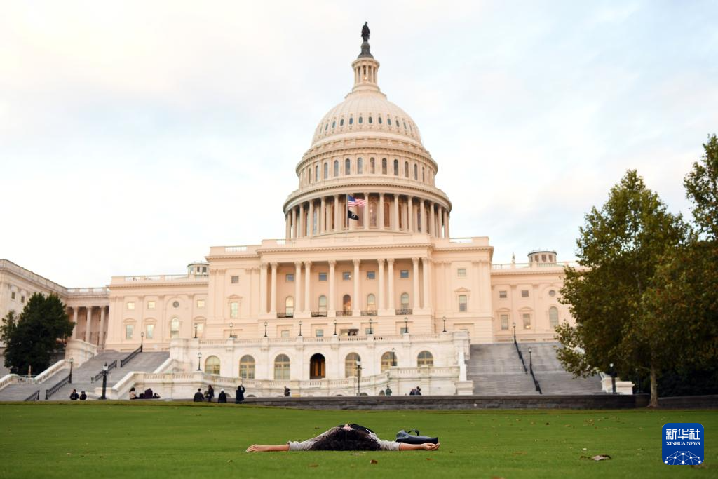10月15日,在美國華盛頓,一名女子躺在國會大廈前的草坪上。新華社記者 李睿 攝