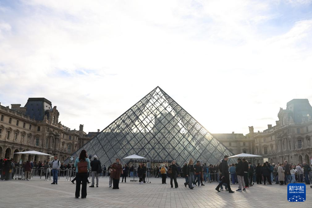 10月22日,在法國巴黎,大量游客聚集在盧浮宮博物館的玻璃金字塔入口前。在法國盧浮宮搶劫案事發3天后,這座博物館22日恢復開放。新華社記者 張百慧 攝