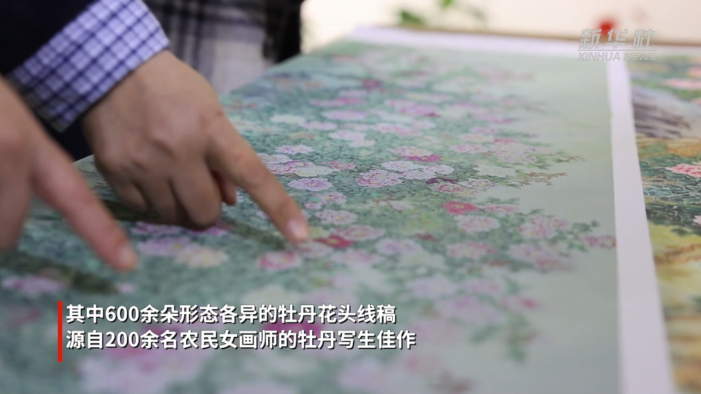 畫卷以澄澈天青為底色,巧妙融合工筆寫實的細膩與水墨寫意的靈動,完整呈現菏澤牡丹9大色系、10大花型。其中600余朵形態各異的牡丹花頭線稿,源自200余名農民女畫師的牡丹寫生佳作。
