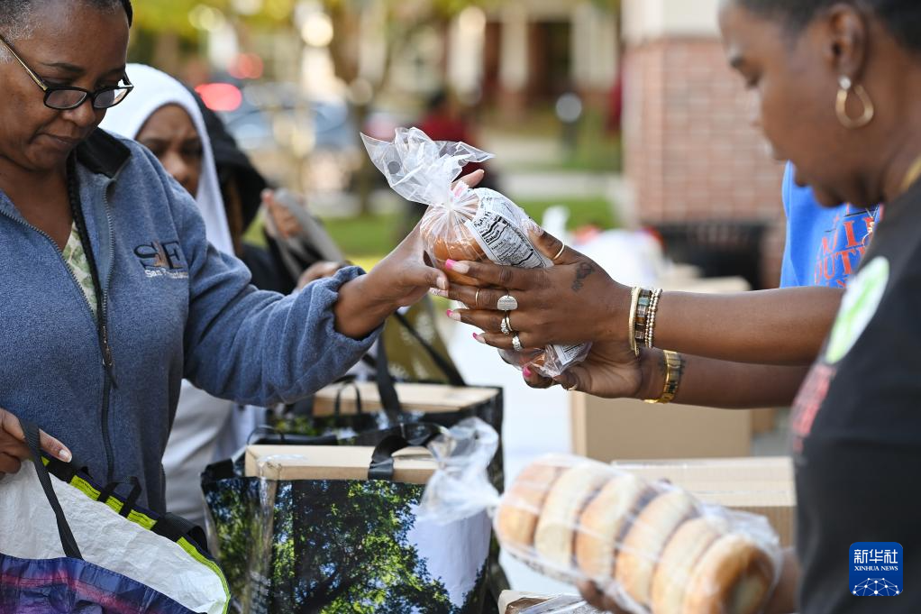 10月21日,在美國馬里蘭州海厄茨維爾市,聯邦雇員領取免費食品。新華社記者 李睿 攝