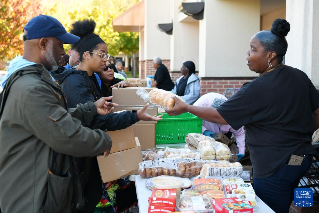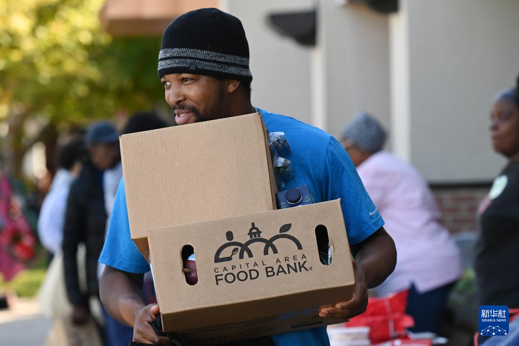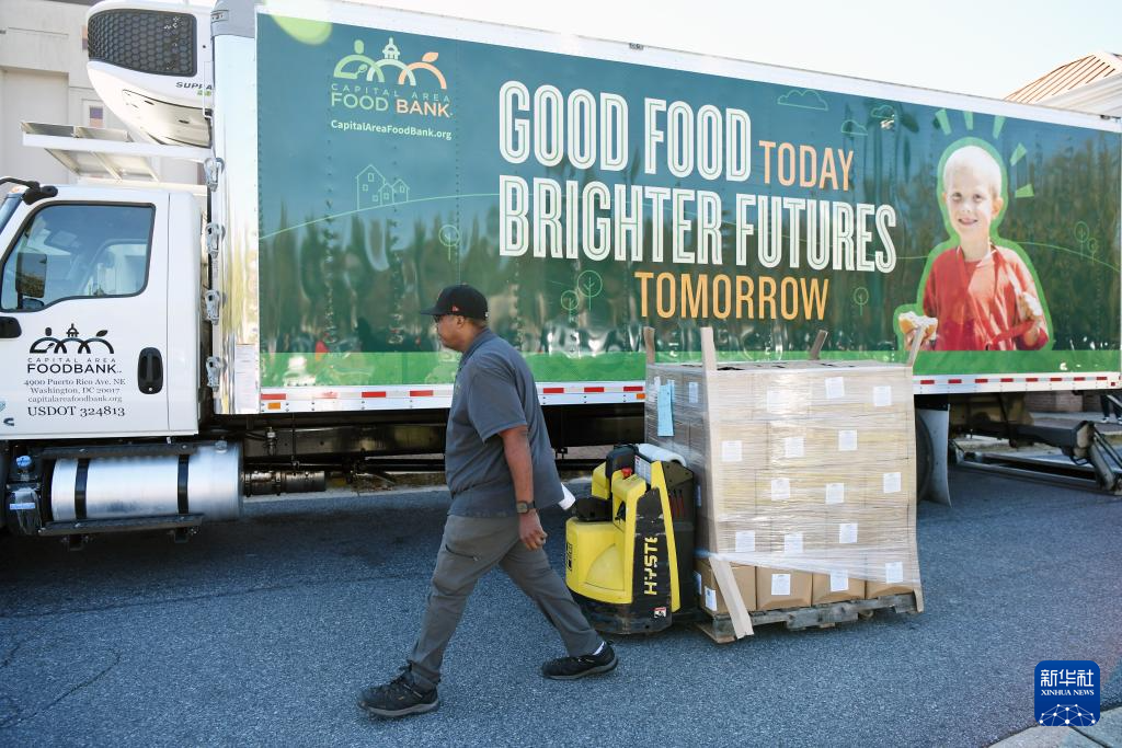10月21日,在美國馬里蘭州海厄茨維爾市,工作人員從一輛裝有救濟食品的卡車中運出食品準備發放。新華社記者 李睿 攝
