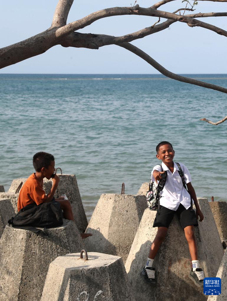 9月17日,在東帝汶帝力,兩名兒童在海邊玩耍。新華社記者 岑云鵬 攝