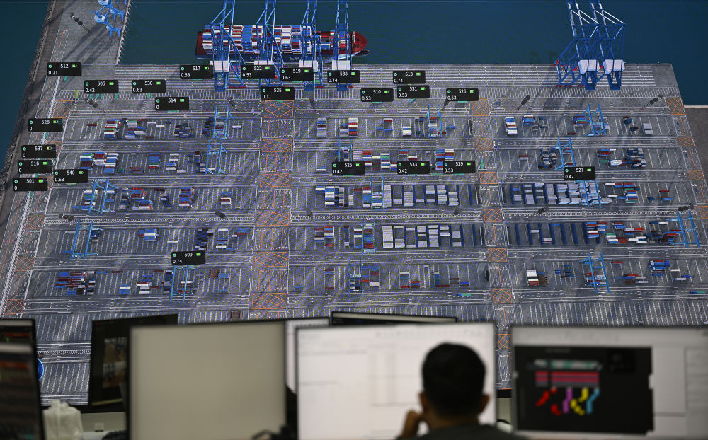 2025年5月16日,在秘魯錢凱港的中遠海運港口秘魯錢凱公司前方運營大樓,工作人員通過屏幕監測港口運行情況。錢凱港是中國與秘魯共建“一帶一路”標志性項目,2024年11月正式開港,成為連接亞洲與拉美最重要的航運樞紐之一。