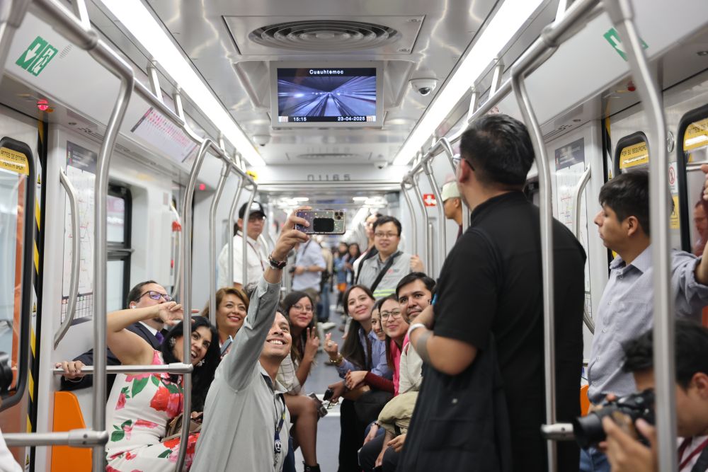 2025年4月23日,在墨西哥首都墨西哥城,媒體記者在地鐵新1號線列車上合影。當日,墨西哥城地鐵新1號線舉行部分通車儀式,中國企業助力全面升級系統設備,改善市民通勤體驗。