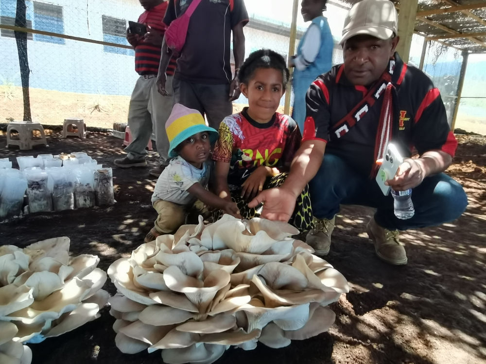 2025年9月29日,在巴布亞新幾內亞東高地省首府戈羅卡市,當地民眾參觀中國援巴布亞新幾內亞菌草旱稻項目永久性示范基地種植的大平菇。2018年以來,中方在當地舉辦技術培訓班41期,培訓學員3200余人,技術推廣到巴新10個省20個地區,成千上萬當地民眾從中受益。