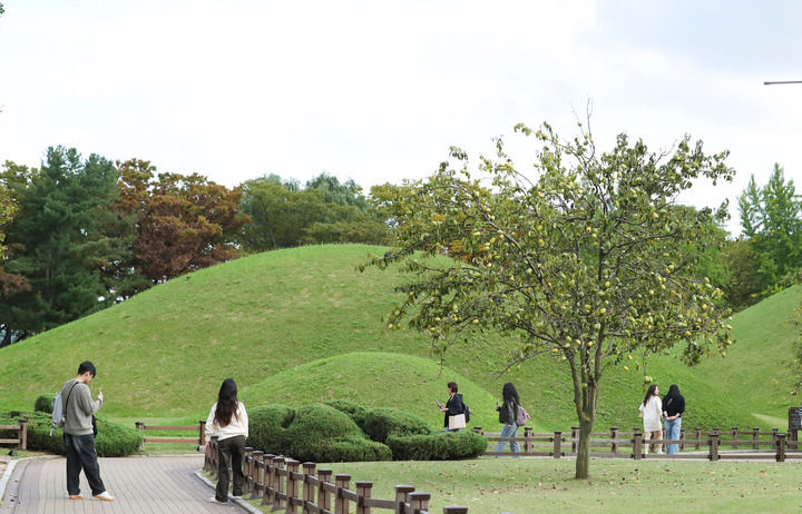 慶州市中心的大陵苑是1000多年前新羅王朝時期的墓葬群,這里共有20多座王陵與貴族墓,隆起的“土堆”錯落有致,構成一片靜默的波浪。草坡的綠意仍在延續,枝頭的柿子卻已被秋陽染成金黃。一樹一丘,一黃一綠,如油畫般層次分明,古老的王陵在這柔和的色調中更顯寧靜和浪漫,恰是慶州秋天最靜美的時刻。