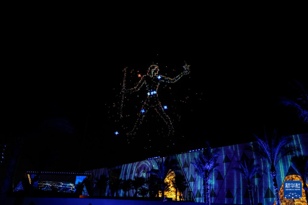 這是11月1日在埃及吉薩拍攝的開館儀式上的無人機表演和燈光秀。新華社發(艾哈邁德·戈馬攝)