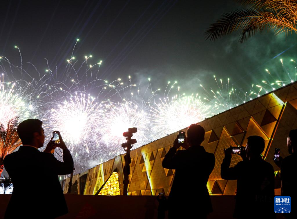 11月1日,人們在埃及吉薩舉行的開館儀式上拍攝煙花和燈光秀表演。新華社發(艾哈邁德·戈馬攝)