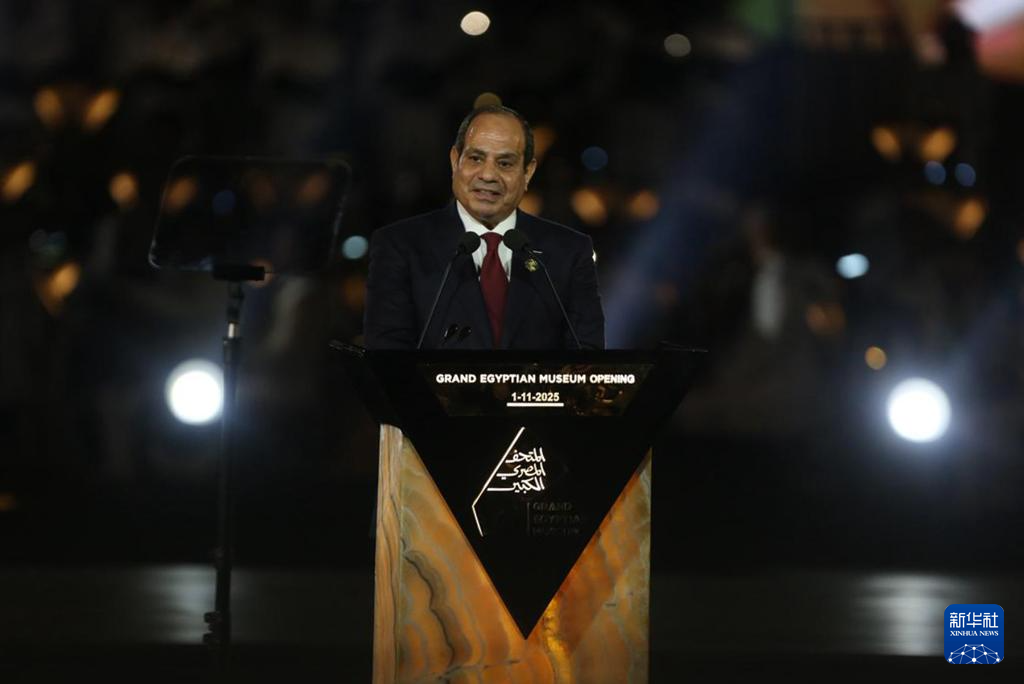 11月1日,在埃及吉薩,埃及總統塞西在開館儀式上致辭。世界最大單一文明博物館——大埃及博物館11月1日正式開館。數十個由各國元首、政府首腦、地區和國際組織負責人率領的官方代表團參加了當晚舉行的開館儀式。 新華社發