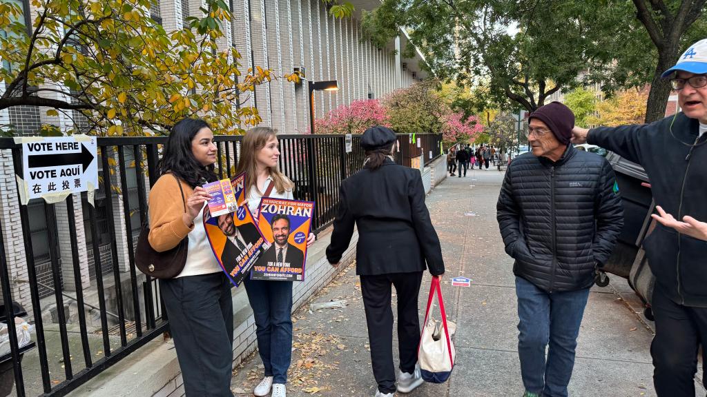 11月4日,支持者在美國紐約一個投票站外手持候選人祖赫蘭·馬姆達尼的競選海報(手機拍攝)。新華社發(周煥新攝)