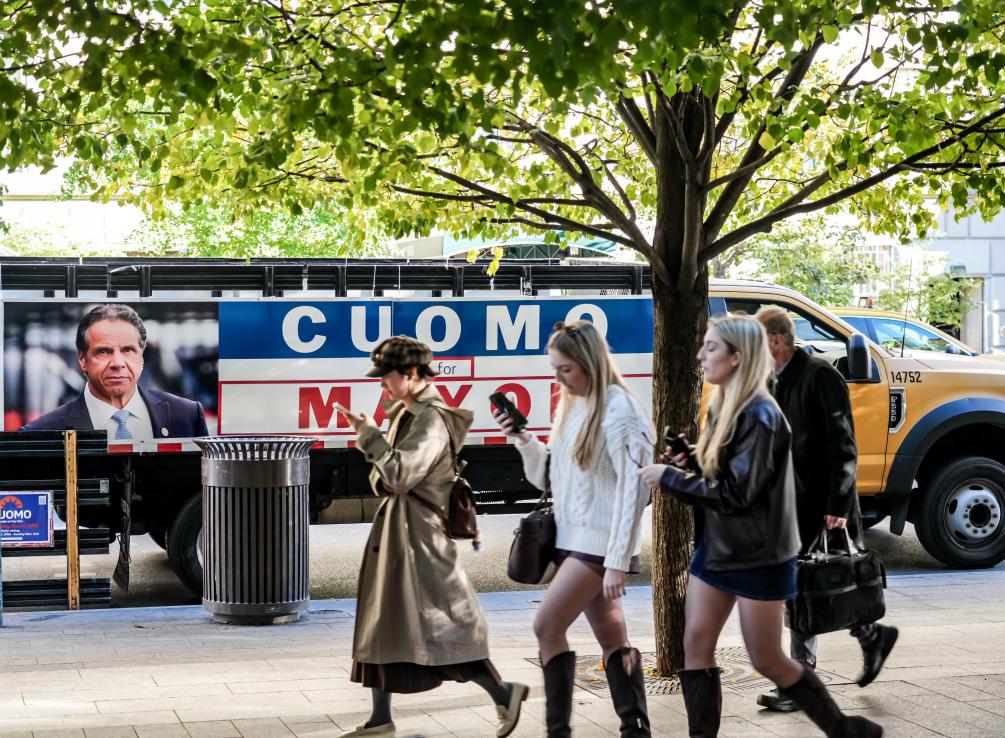 11月4日,在美國紐約,行人經過候選人安德魯·科莫的競選海報。新華社發(章正浩攝)
