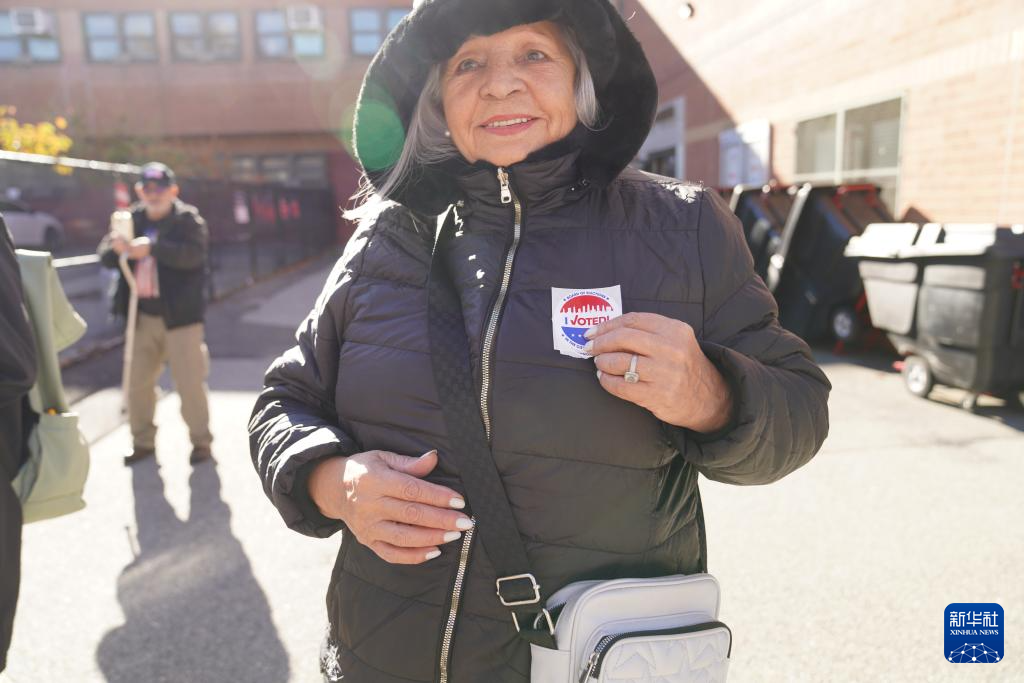 11月4日,在美國紐約市的一個投票站,一名女士展示已投票標志。