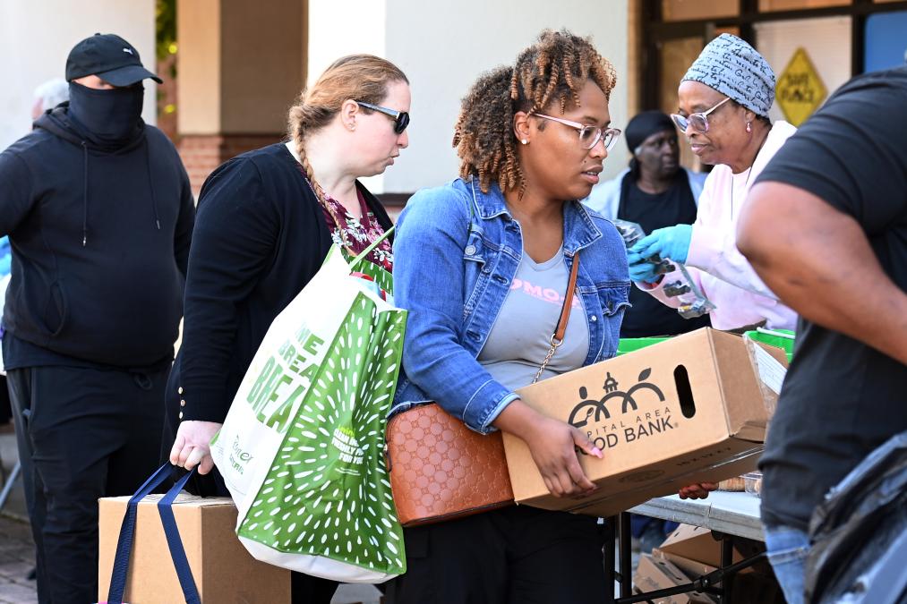 10月21日,在美國馬里蘭州海厄茨維爾市,聯邦雇員領取免費食品。新華社記者李睿攝