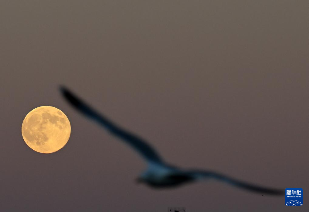 這是11月5日在意大利羅馬拍攝的“超級月亮”與海鷗。