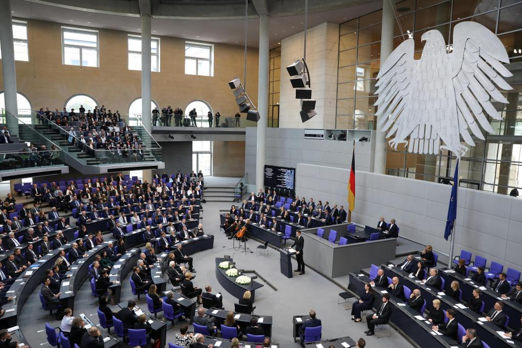 這是5月8日在德國首都柏林國會大廈拍攝的紀念活動現場。新華社記者杜哲宇攝
