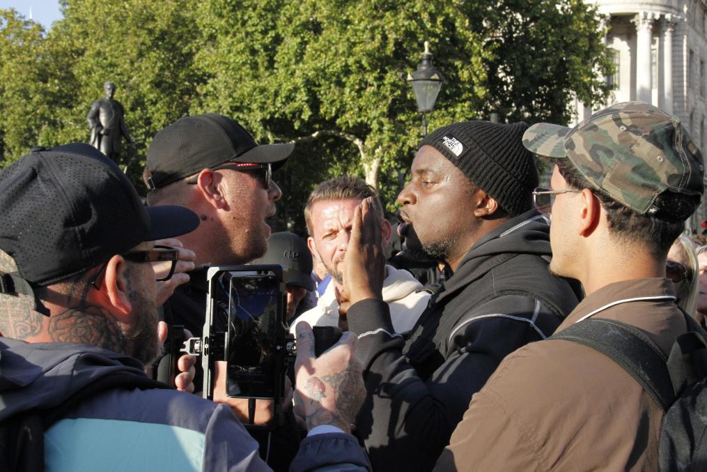 9月13日,在英國首都倫敦,對移民持不同觀點的人們在抗議活動現場爭辯。新華社記者高文成攝