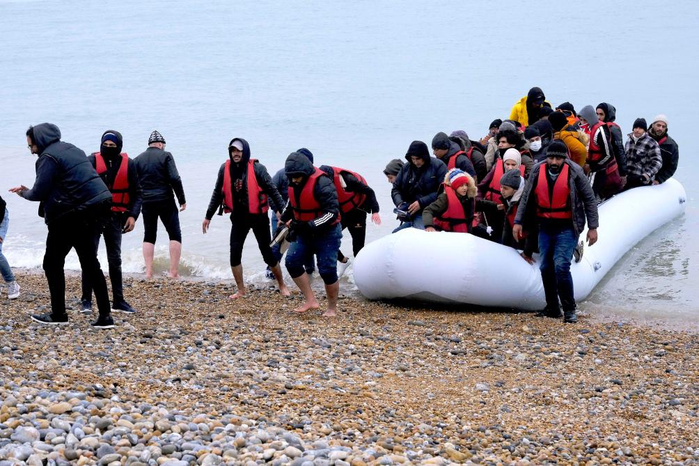 2021年11月24日,移民乘船抵達英國鄧杰內斯角海岸。新華社發(史蒂夫·芬恩攝)
