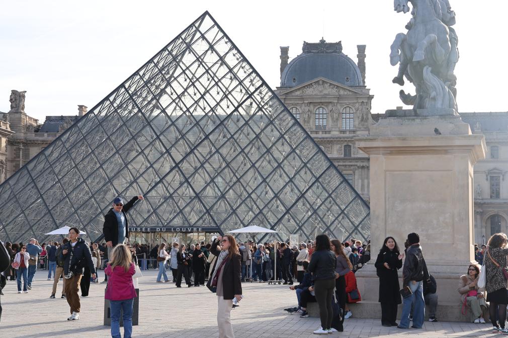 10月22日,在法國巴黎,大量游客聚集在盧浮宮博物館的玻璃金字塔入口前。新華社記者張百慧攝