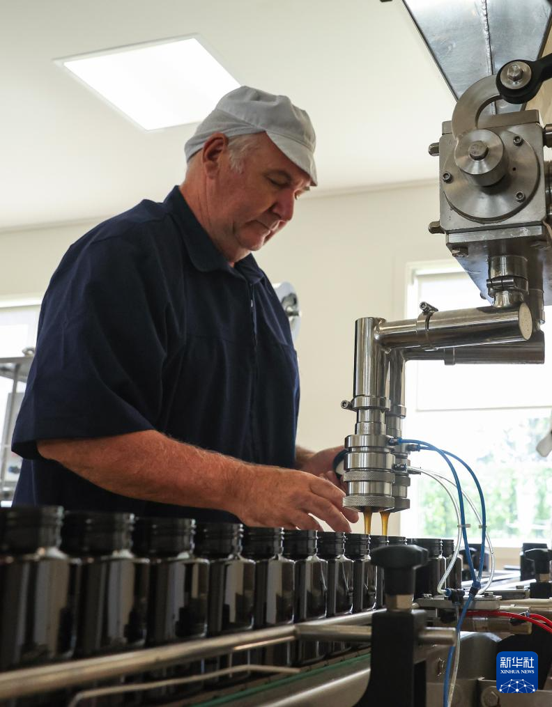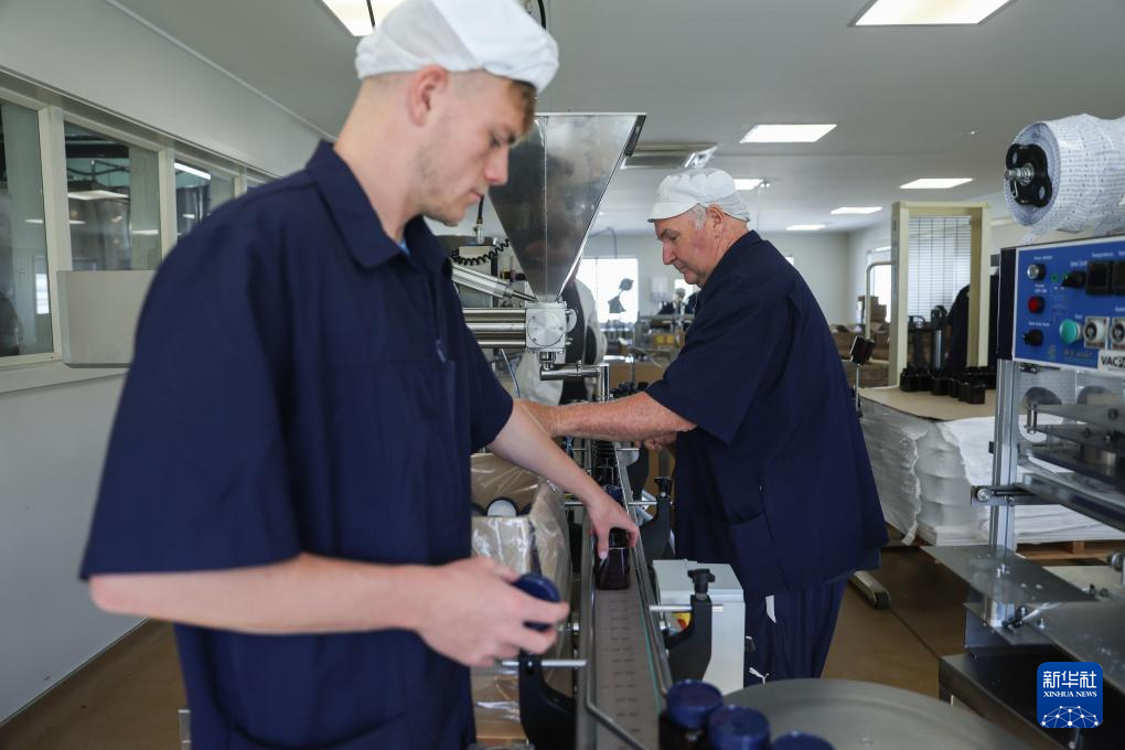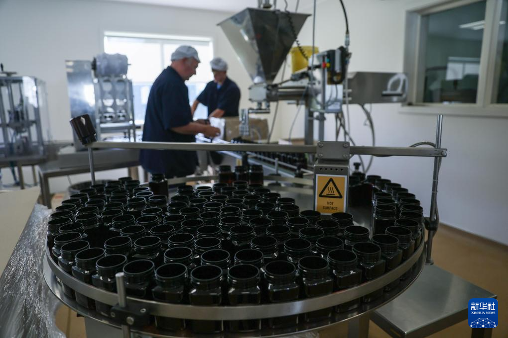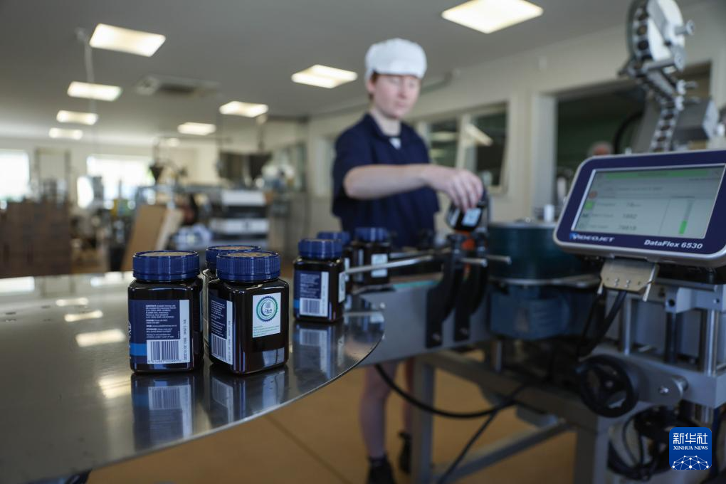 10月29日,在新西蘭北島一家蜂蜜生產企業的生產車間,工作人員在流水線上工作。