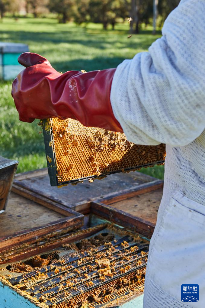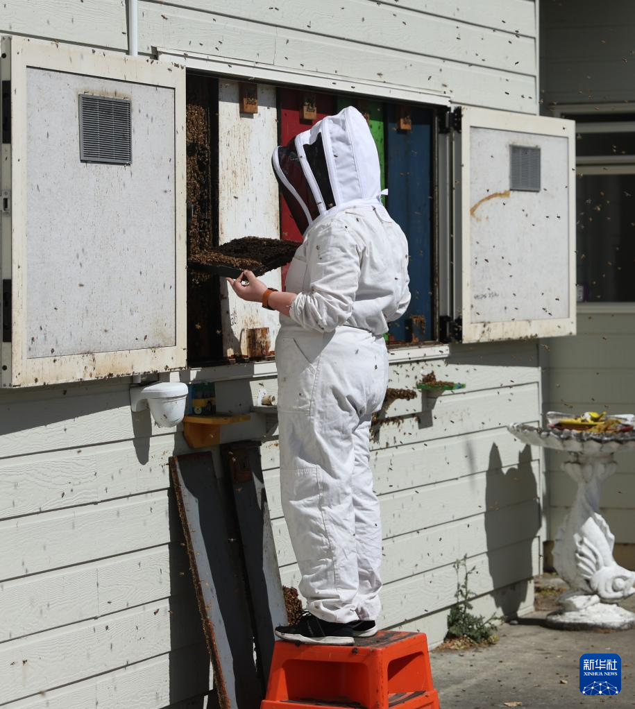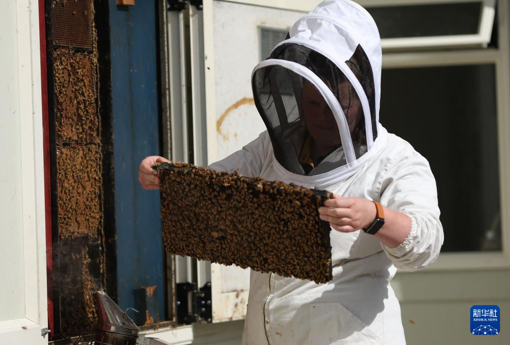 10月29日,在新西蘭北島一家蜂蜜生產企業的展示區,工作人員檢查蜂后的健康狀態。