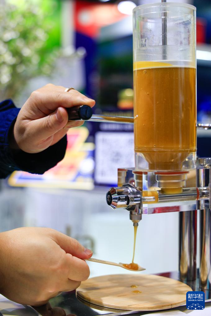 11月6日,在第八屆進博會農食產品展區一家新西蘭蜂蜜品牌展臺,一名參展商為觀眾取蜜。