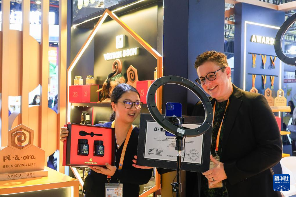 11月6日,在第八屆進博會農食產品展區一家新西蘭蜂蜜品牌展臺,參展商在直播。
