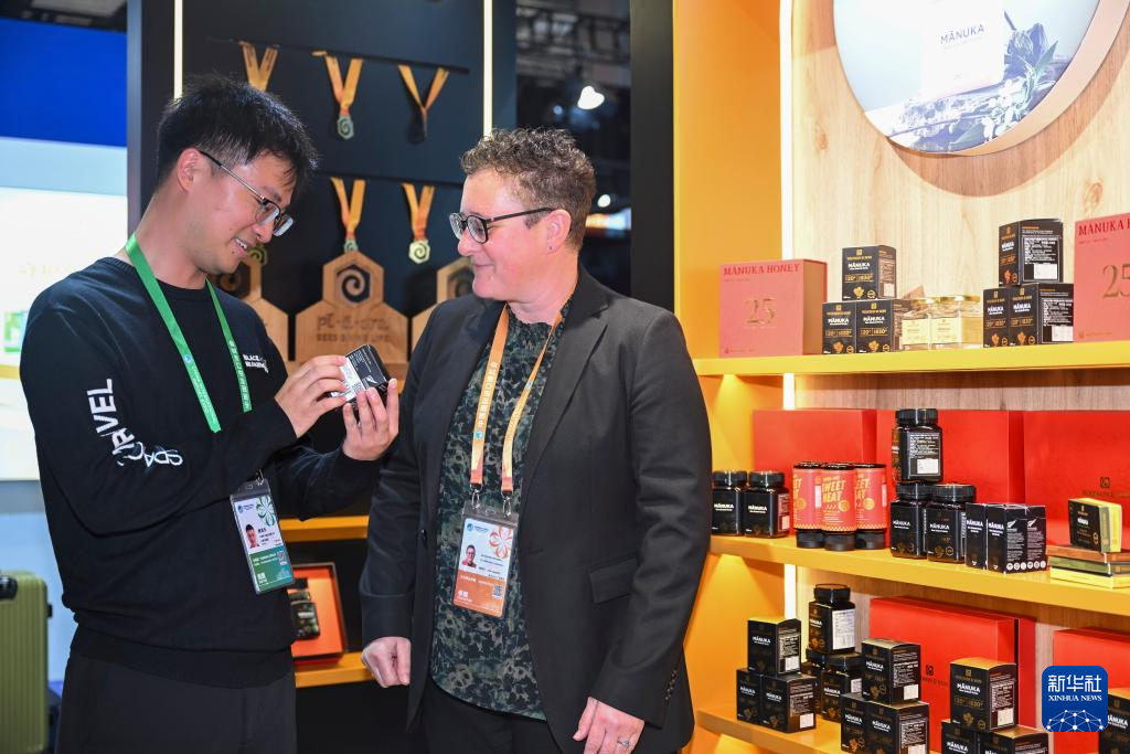 11月6日,在第八屆進博會農食產品展區一家新西蘭蜂蜜品牌展臺,一名觀眾(右)和參展商交談。